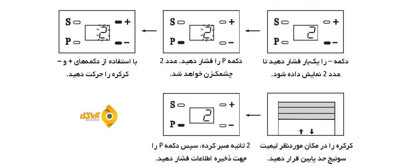 درب را به آرامی حرکت دهید تا غلتک درگیر شود و دستگاه بتواند کرکره را کنترل کند . پس از وصل کردن تغذیه دستگاه ، لامپ روشنایی روشن شده دستگاه یک بوق زده و نمایشگر عدد 0 را نشان خواهد داد .