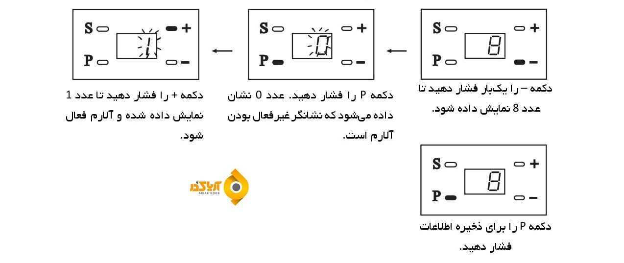 2. در صورتی که آلارم دستگاه فعال شود ، با باز ماندن درب به مدت 10 دقیقه آلارم برای 30 ثانیه فعال شده و پس از گذشت هر 10 دقیقه مجدد آلارم خواهد زد .