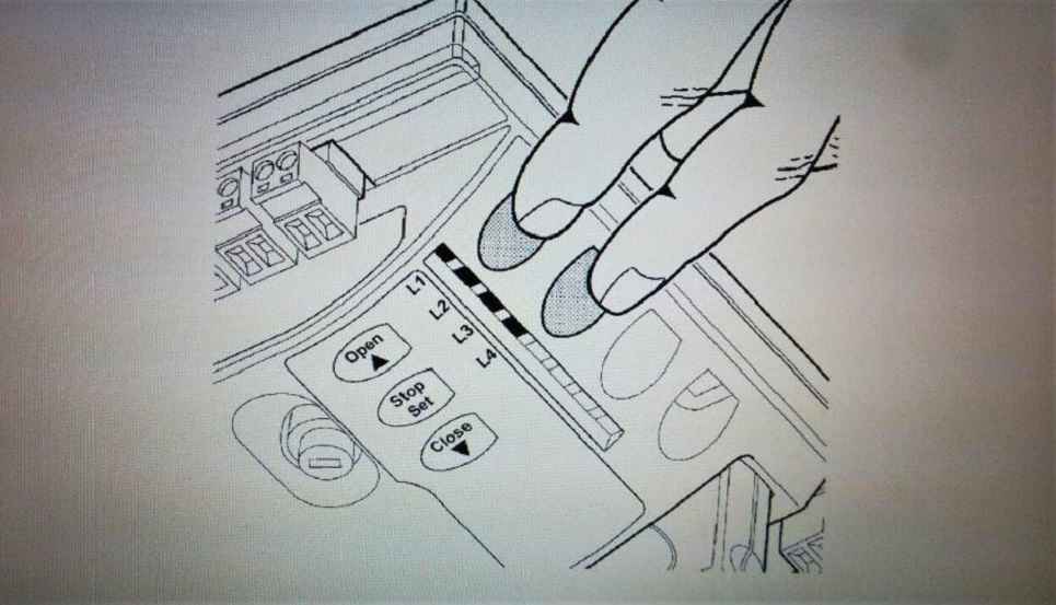 کلیدهای stop و open را با هم نگه داشته تا چراغ های L1 و L2 شروع به تند چشمک زدن نماید ، بعد کلیدها را رها کنید . پس از 3 ثانیه چراغ های L1 و L2 خاموش شده و چراغ های L3 و L4 شروع به چشمک زدن می کند . یعنی لوازم جانبی شناسایی شده و در حافظه دستگاه ذخیره گردید .