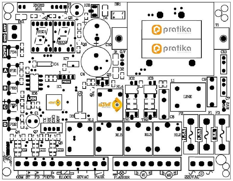 هر جا که لازم است حرکت آهسته شود ، یکبار دکمه C روی برد یا ریموت(معرفی شده به کانالLA ) را بفشارید تا جک یک وارد دور آهسته شود . سپس منتظر بمانید تا درب یک به انتهای کار برسد و به انداره 5 ثانیه درجا کار کند. حال مجددا دکمه C یا ریموت را بفشارید تا جک یک متوقف و جک دو با دور تند باز شود. همان عملیات جک یک را برای جک دو تکرار کنید تا هر دو درب کاملا باز شوند و متوقف گردند.