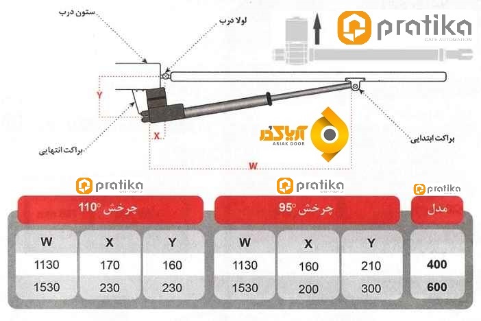 درب را تا زاویه مورد نظر باز کنید. براساس مقادیر X و Y و زاویه بازشو متناسب با آنها (مطابق جدول ذیل). پلیت سرجک را بر روی اپراتور قرار دهید و جک را روی درب قرار داده و محل قرارگیری پلیت سرجک را علامت بزنید. سپس پلیت سرجک را به درب جوش دهید به نحوی که جک کاملا به صورت افقی قرار گرفته باشد.